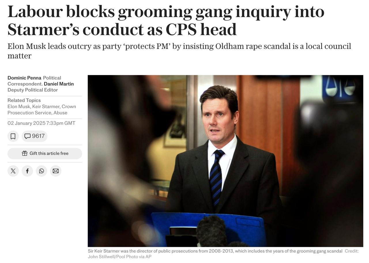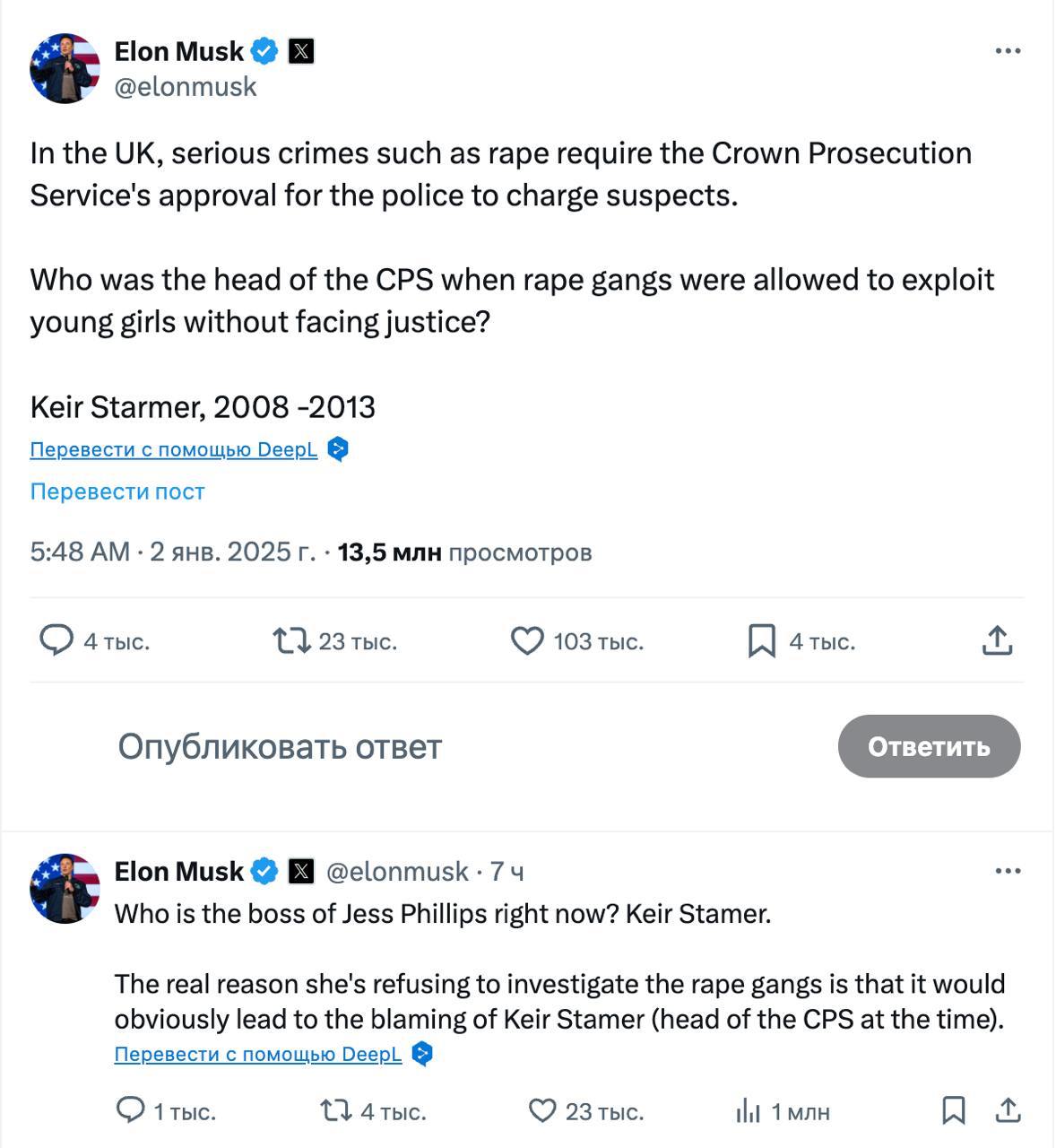 "У Великій Британії для пред'явлення звинувачень підозрюваним у скоєнні таких серйозних злочинів, як зґвалтування, поліції потрібне схвалення Королівської прокурорської служби. Хто був главою Королівської прокурорської служби, коли бандам ґвалтівників було дозволено експлуатувати молодих дівчат, без притягнення їх до відповідальності? Кір Стармер, 2008-2013 р.", - написав Маск.