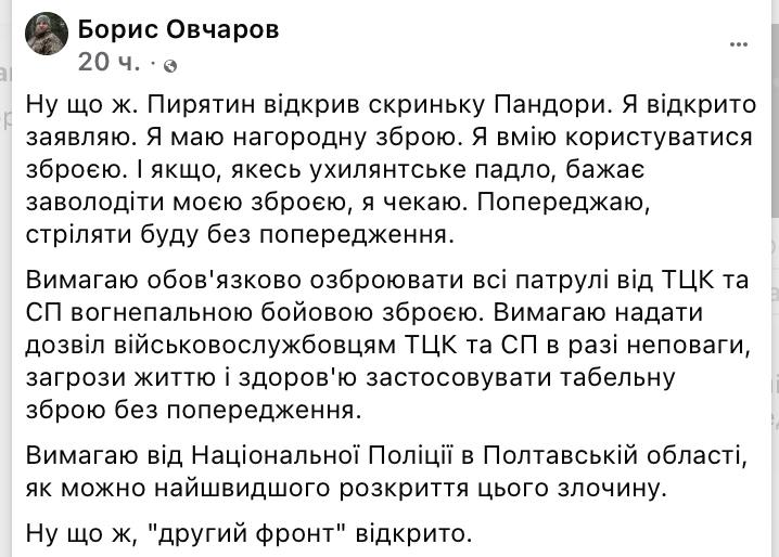 "Пирятин відкрив ящик Пандори. Я відкрито заявляю. Я маю нагородну зброю. Я вмію користуватися зброєю. І якщо, якесь ухилянтське падло, бажає заволодіти моєю зброєю, я чекаю. Попереджаю, стрілятиму без попередження", - написав він.