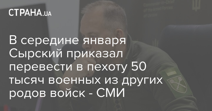 Головнокомандувач ЗСУ Олександр Сирський підписав наказ про переведення в піхоту приблизно 50 тисяч військових усіх родів та видів військ для початку ротацій у бойових бригадах. Наказ було віддано 11 січня.