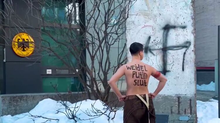 На її тілі також була нацистська символіка та слоган "Хайль Вайдель" (Аліса Вайдель - глава "АдГ"). Вона вигукувала "Вайдель - повія Путіна" і зигувала.
