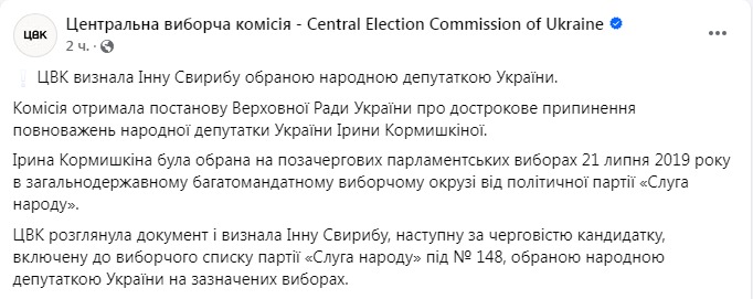 Центральна виборча комісія визнала Інну Свирибу обраним народним депутатом України, отримавши постанову Верховної Ради про дострокове припинення повноважень народного депутата Ірини Кормишкіної (також відома під прізвищем Аллахвердієва).