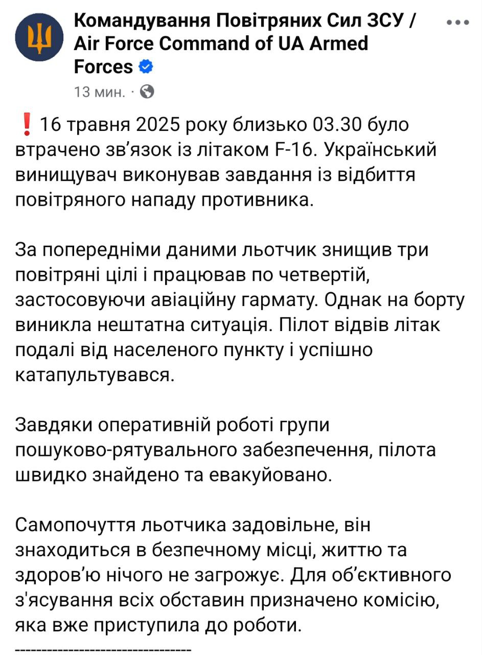 16 травня 2025 року близько 03.30 було втрачено зв'язок з літаком F-16. Український винищувач виконував завдання щодо відображення повітряного нападу противника.