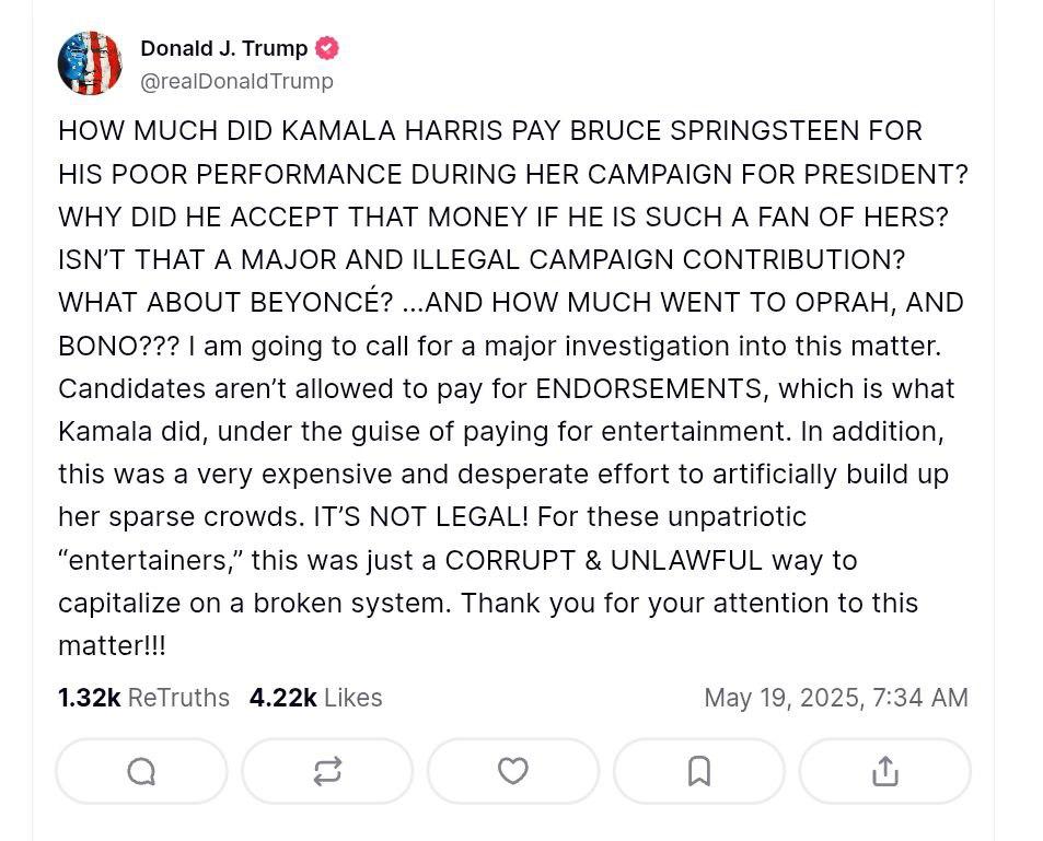 "Скільки Камала Харріс заплатила Брюсу Спрінгстіну за його слабкий виступ під час її президентської кампанії? Чому він погодився взяти ці гроші, якщо він такий її шанувальник? Хіба це не велика і незаконна пожертва на кампанію А як щодо Бейонсе? …І скільки отримали Опра (телеведуча Опра Вінфрі – Ред.) та Боно (вокаліст ірландської групи U2 – Ред.)? Я збираюся вимагати серйозного розслідування цього питання. Кандидатам заборонено платити за підтримку", – написав Трамп.