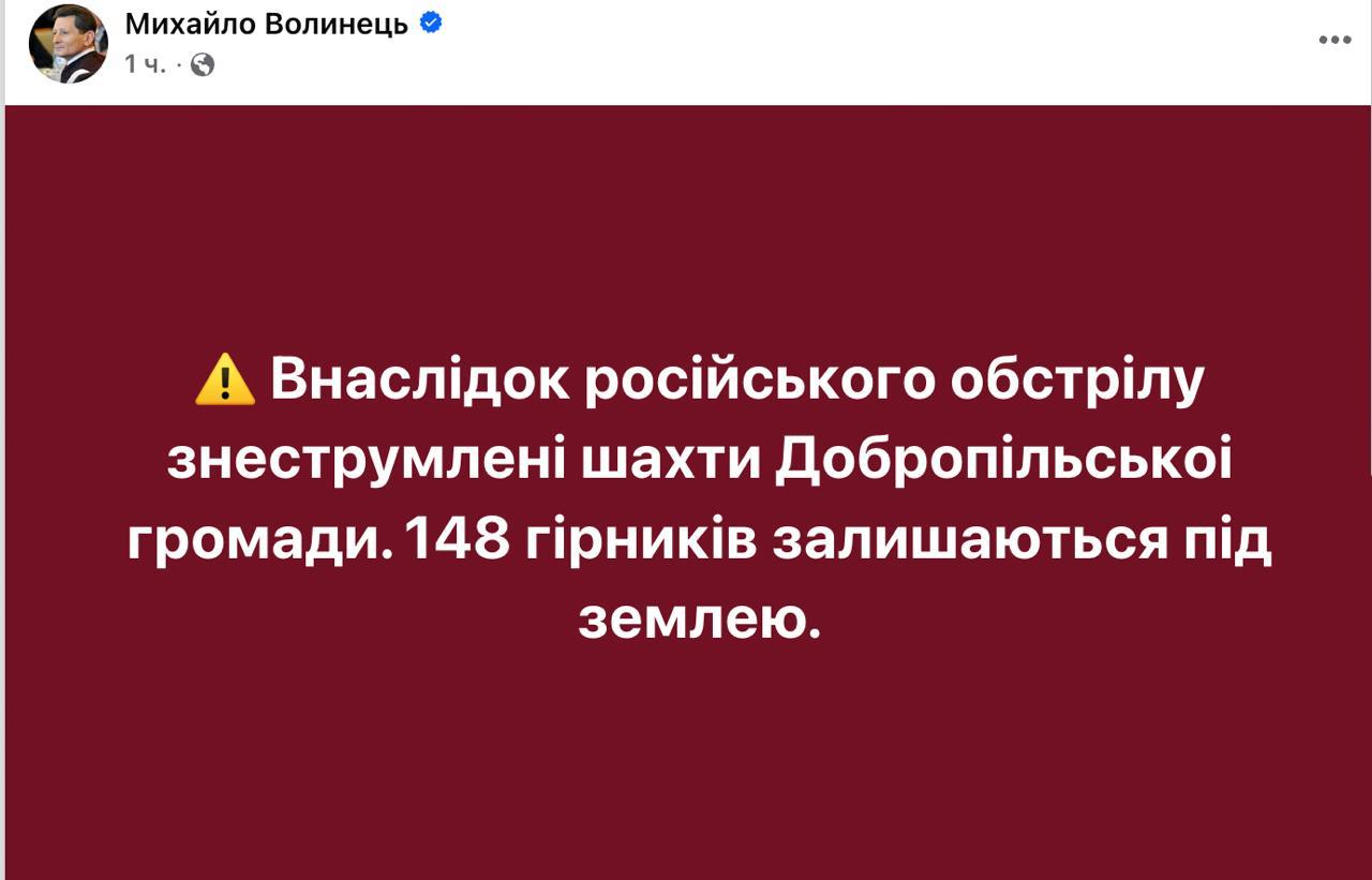 13.26 У прифронтовому Добропільському районі Донецької області 148 шахтарів застрягли під землею через відключення світла після обстрілу.