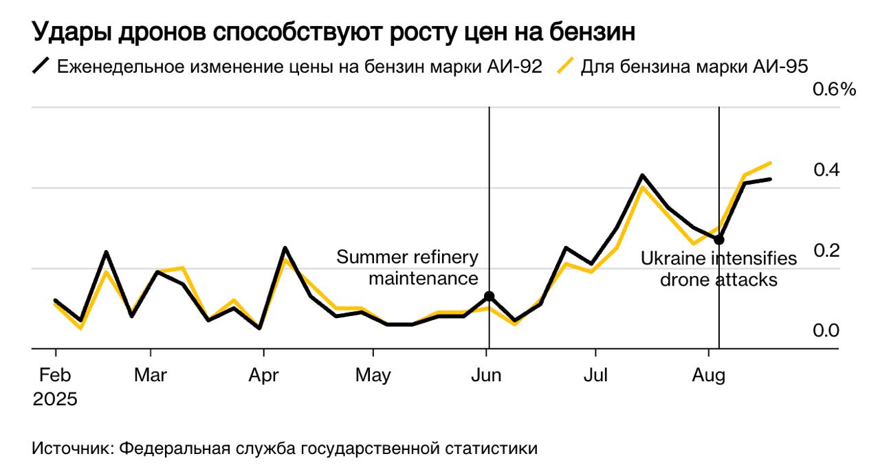 За даними головної товарної біржі РФ, у серпні оптові ціни на бензин по всій Росії зросли приблизно на 40-50% порівняно із середніми значеннями за січень.