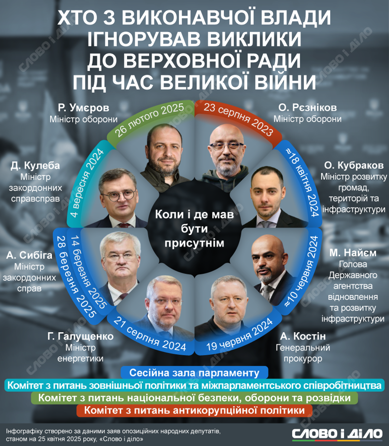 Зазначимо, що раніше міністри та чиновники неодноразово ігнорували виклики до Верховної Ради. Так, за даними видання "Слово і справа", навесні 2025 року міністр закордонних справ Андрій Сибіга двічі відмовився прийти на парламентські засідання, посилаючись на зустрічі за кордоном, а 28 березня проігнорував черговий виклик. Його попередник Дмитро Кулеба не прийшов на засідання профільного комітету перед звільненням. Крім того, міністр енергетики Герман Галущенко не прийшов на комітет із боротьби з корупцією в енергетиці, а міністр оборони Рустем Умеров – на закрите засідання з міжнародної військової допомоги.