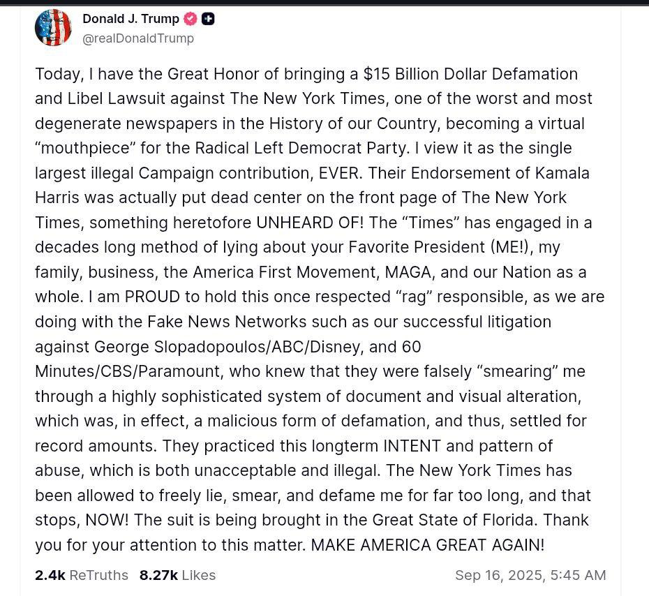 "Я розглядаю це як найбільший незаконний внесок у виборчу кампанію за всю історію. Їх підтримка Камали Харріс була фактично поміщена в центр першої шпальти The New York Times, що досі нечувано! The Times вже десятиліттями бреше про вашого улюбленого президента (про мене!), мою сім'ю, бізнес, і, бізнес," – написав Трамп.