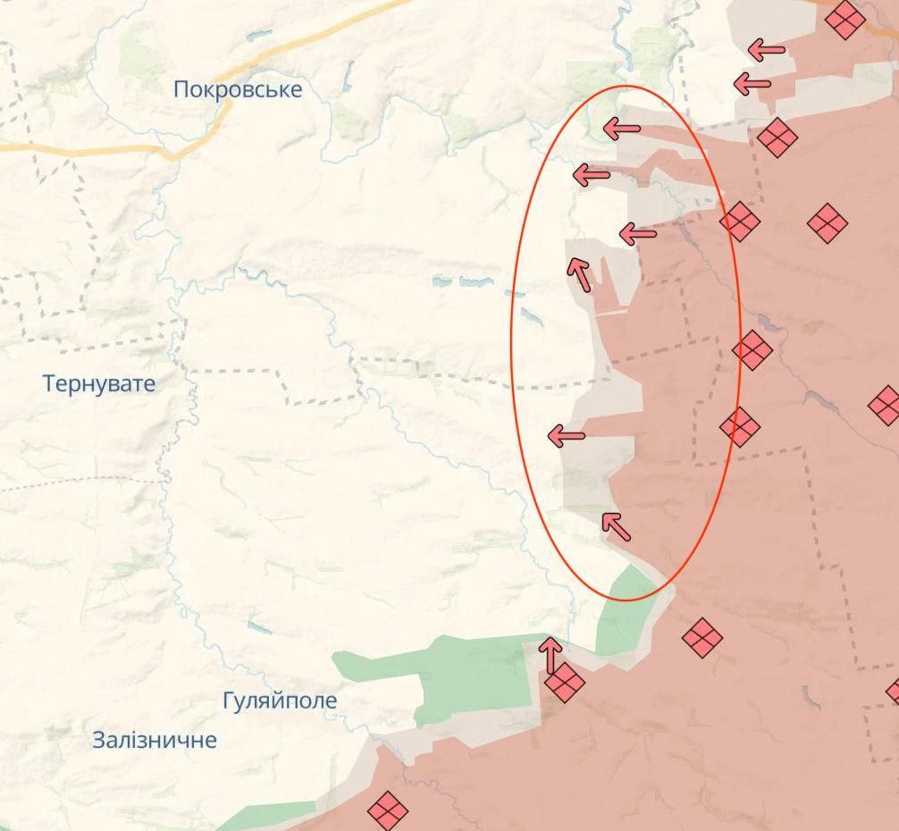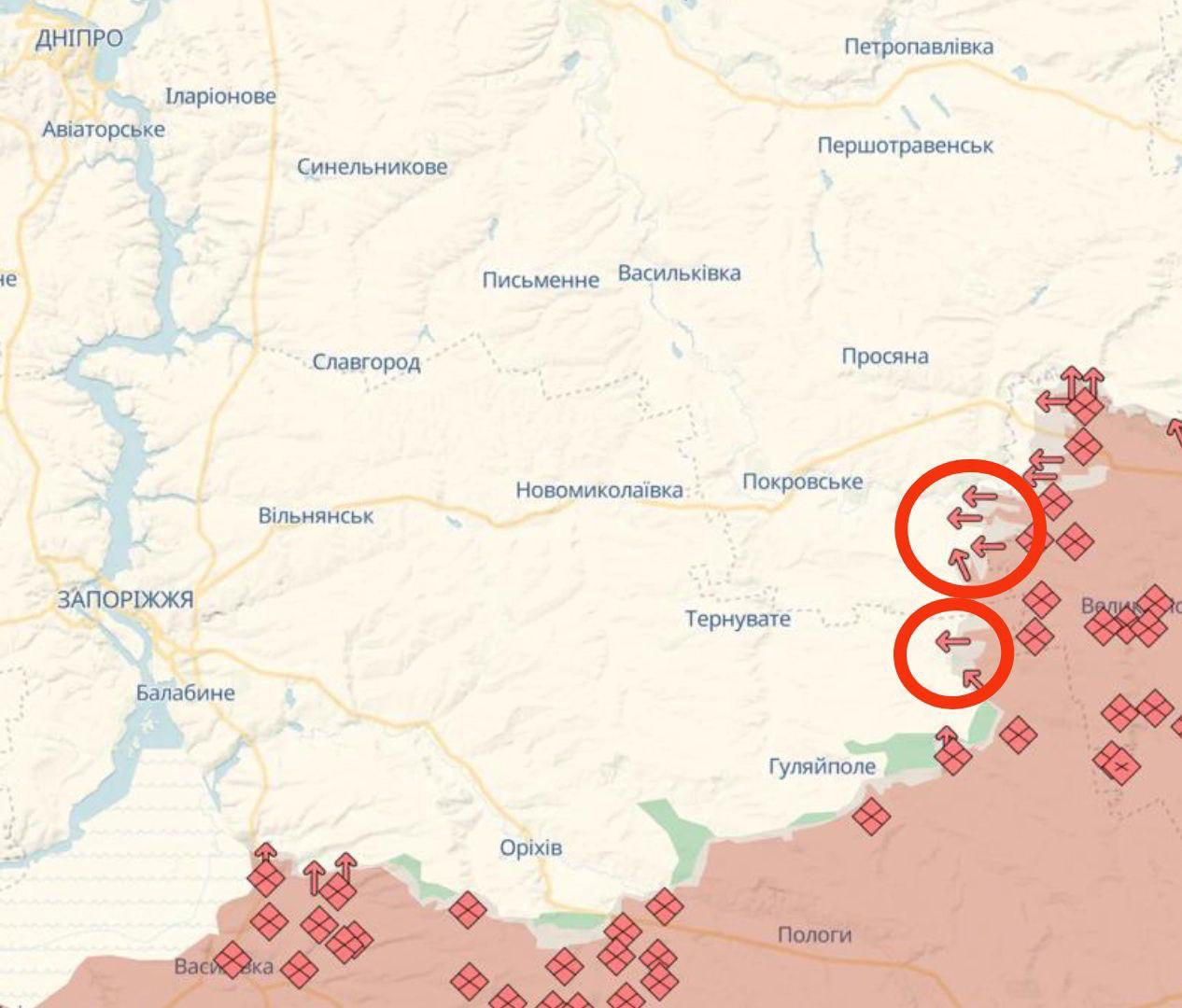 Проте українські військові телеграм-канали фіксують поступ РФ на Дніпропетровщині, хай і не стрімкий, але щоденний. Бої точаться на двох основних ділянках.