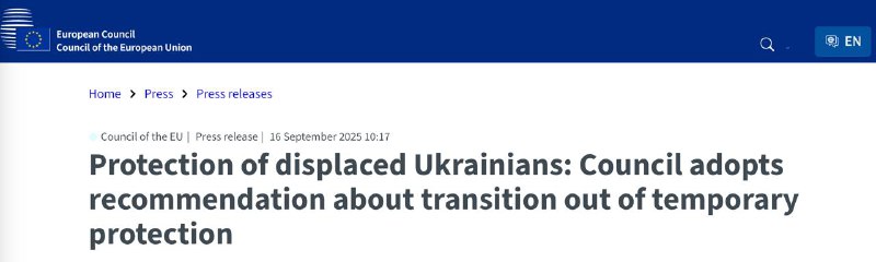 Рада Європейського Союзу схвалила рекомендації для держав-членів щодо повернення, реінтеграції та зміни офіційного статусу українських біженців, коли дозволять умови. План готується на випадок, коли умови в Україні дозволять припинити дію статусу тимчасового захисту.
