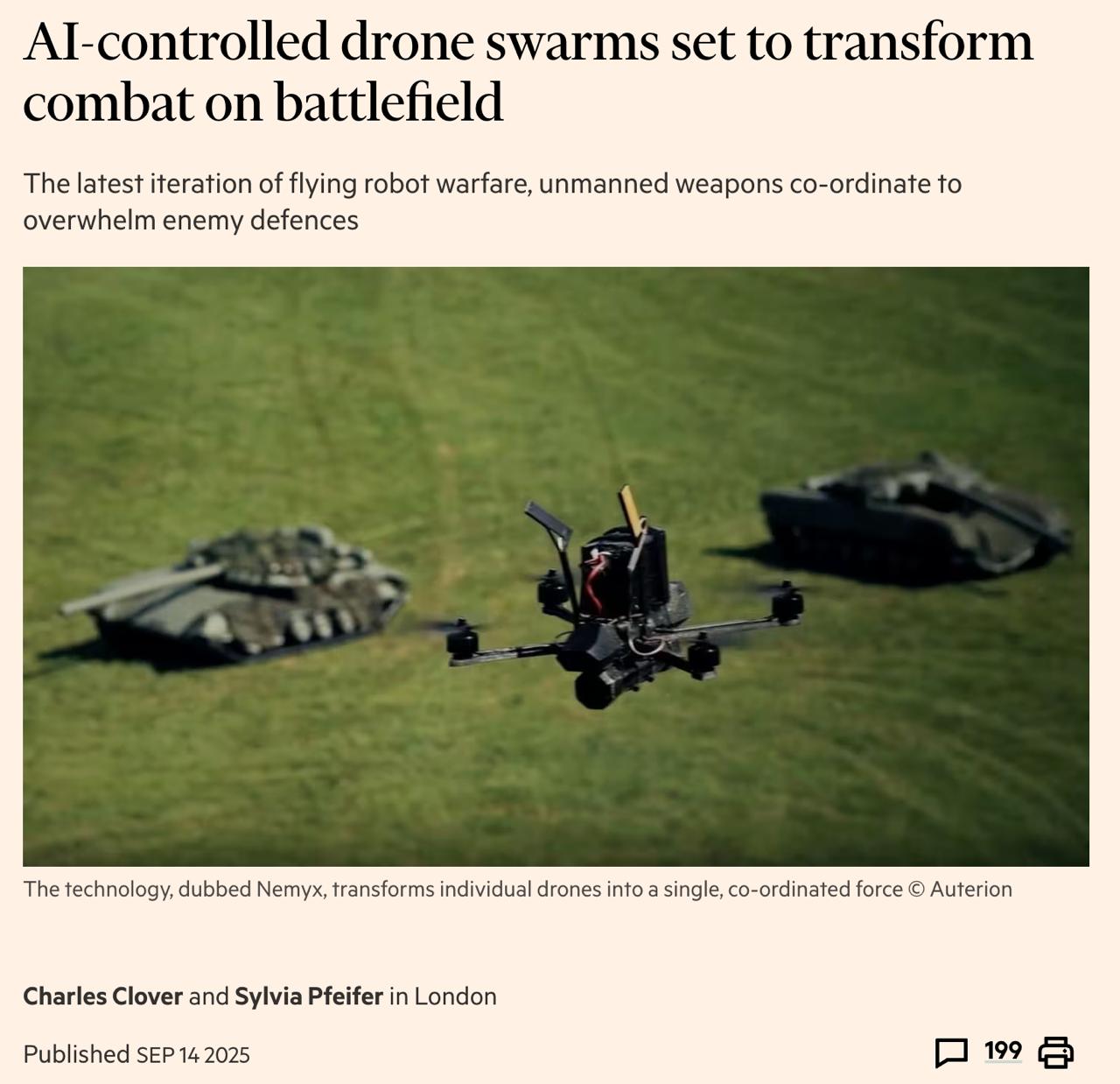 Росія теж навчилася групувати свої "Герані", атакуючи українські міста. Але сучасне програмне забезпечення може зробити тактику роїння смертоноснішою, дозволяючи атакуючим дронам навчатися. Завдяки великому архіву відеоматеріалів з безпілотників, які корисні для навчання моделей штучного інтелекту, українські оборонно-технологічні компанії вважають, що мають вирішальну перевагу перед закордонними конкурентами. Тільки українські компанії мають доступ до секретної бази даних бойових безпілотників, відомої як Universal Military Dataset.