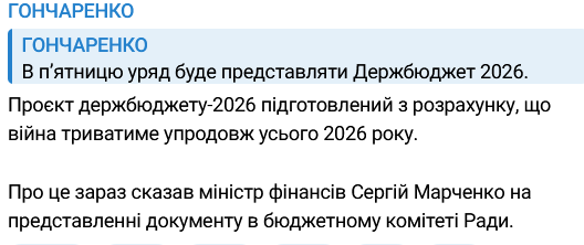 Слова Марченка на засіданні бюджетного комітету Верховної Ради наводить у своєму телеграм-каналі народний депутат (партія "Євросолідарність") Олексій Гончаренко.