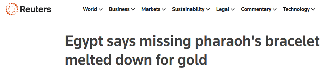 У Єгипті з музею викрали унікальний золотий браслет фараона Аменемопета віком 3000 років. Злодії продали його за $3700 для переплавлення на металобрухт.