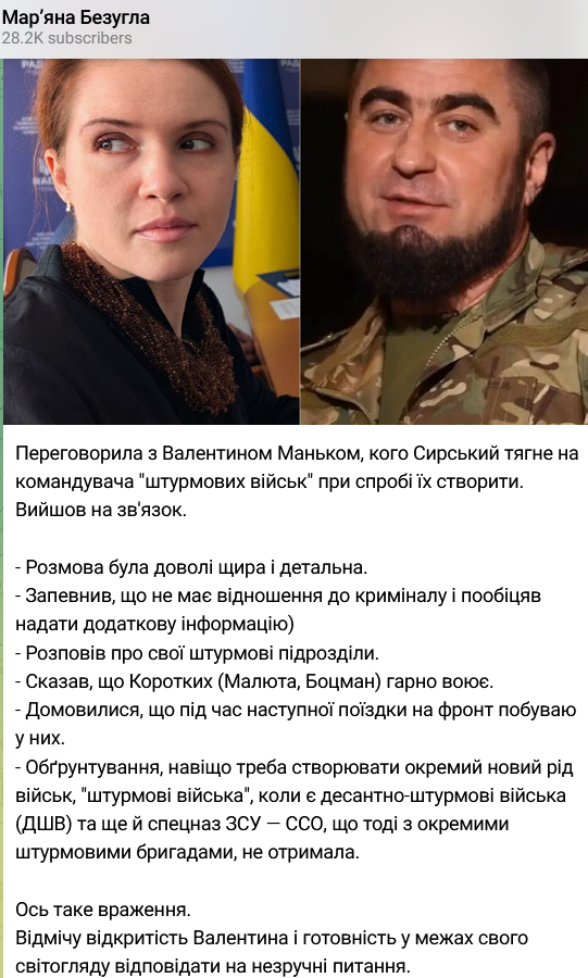Народний депутат Мар'яна Безугла розкритикувала нещодавно призначеного командувача штурмових військ Збройних сил України полковника Валентина Манько.