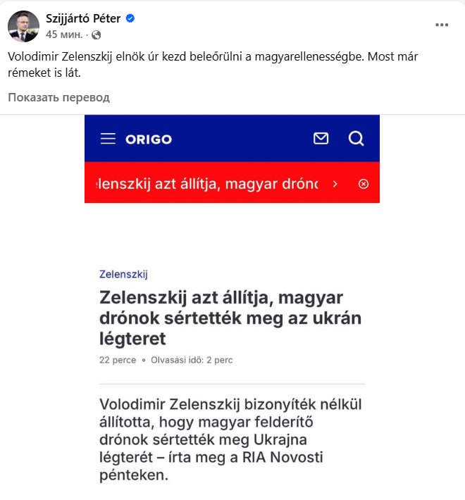 "Володимир Зеленський починає божеволіти від антиугорських настроїв. Тепер йому мерехтять кошмари", - написав Петер Сійярто у Фейсбуці.