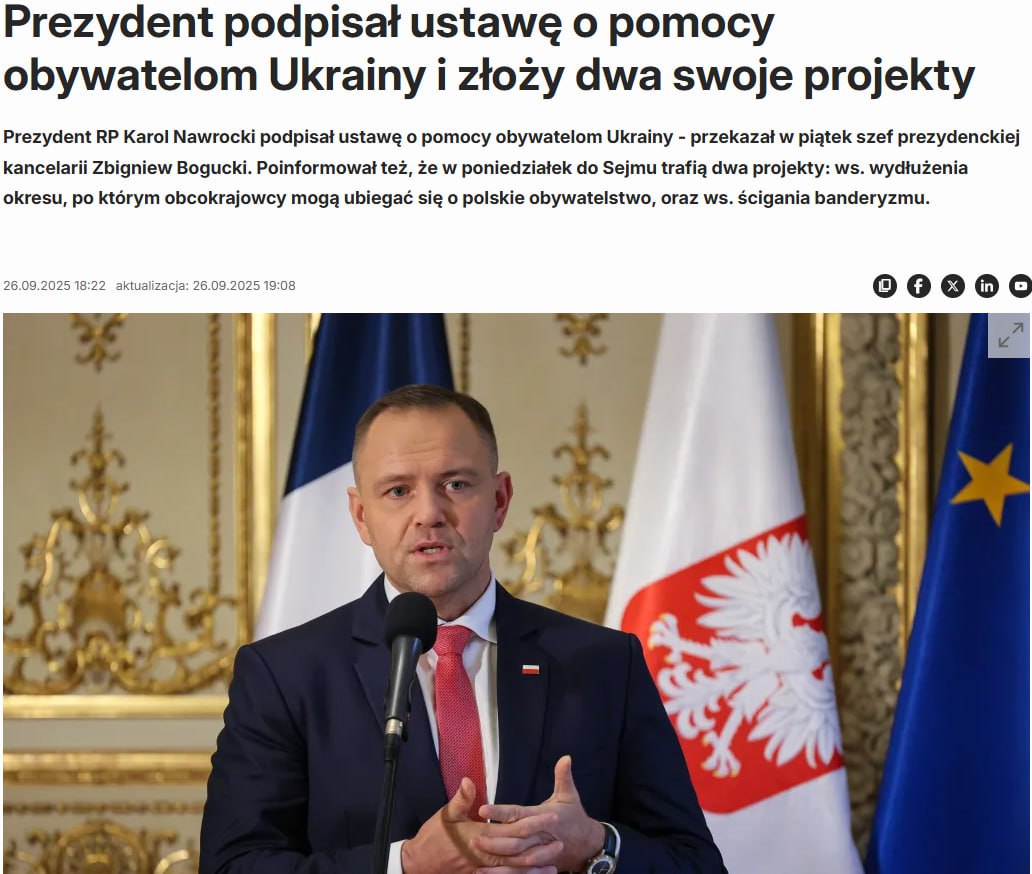Він заявив, що сьогодні президент Кароль Навроцький востаннє підписав закон щодо надання особливої допомоги громадянам України.