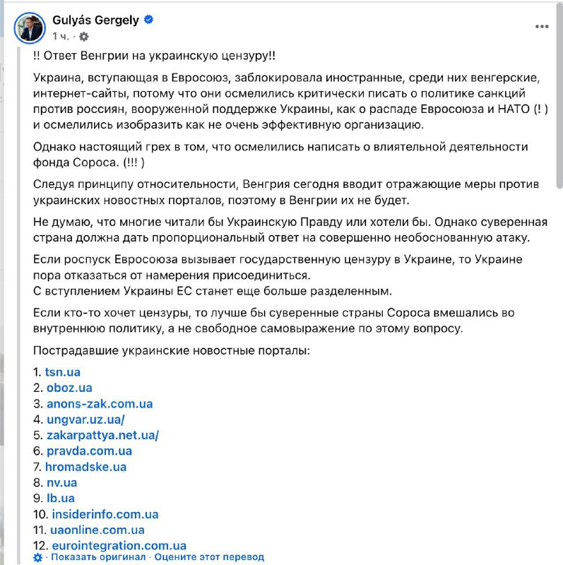 За його словами, Київ заблокував деякі угорські ЗМІ, "бо вони наважилися критично висловлюватися про політику санкцій проти Росії, про збройну підтримку України", а також зображують Європейський Союз і НАТО "як роздроблені та не надто ефективні організації". Однак справжній гріх заблокованих медіа у тому, що вони писали про впливову діяльність фонду Сороса, вважає Гуйяш.