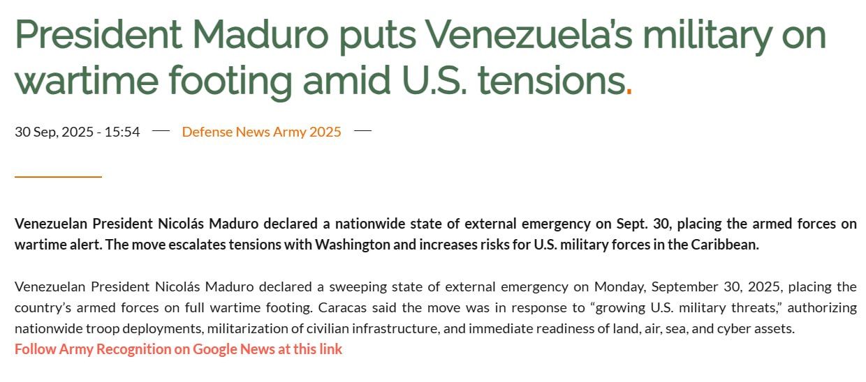 Президент Венесуели Ніколас Мадуро оголосив про запровадження надзвичайного стану у зовнішніх силах країни, привівши збройні сили у стан бойової готовності.