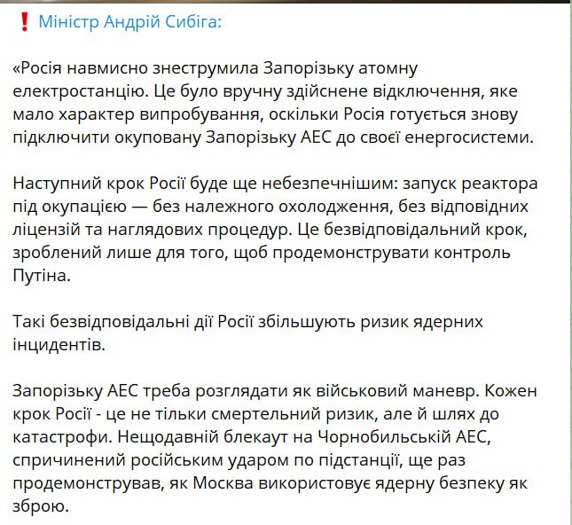 РФ навмисно знеструмила Запорізьку АЕС, щоб підключити її до своєї енергосистеми - Сибіга