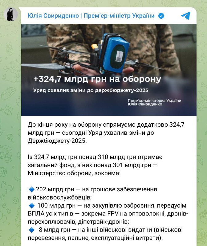 Ще 100 мільярдів гривень підуть на закупівлю озброєнь, насамперед БПЛА. 4,3 мільярда гривень на закупівлю дронів отримає Державна служба спеціального зв'язку та захисту інформації.