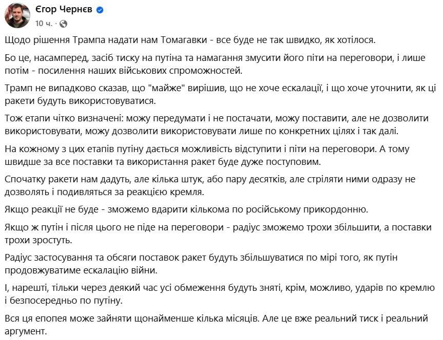 Тим часом народний депутат із "Слуги народу" Єгор Чернєв вважає, що президент США Дональд Трамп може розтягнути постачання Україні "Томагавків" на місяці. При цьому спочатку їх заборонять використовувати для ударів по РФ, щоб оцінити реакцію Володимира Путіна на факт постачання.