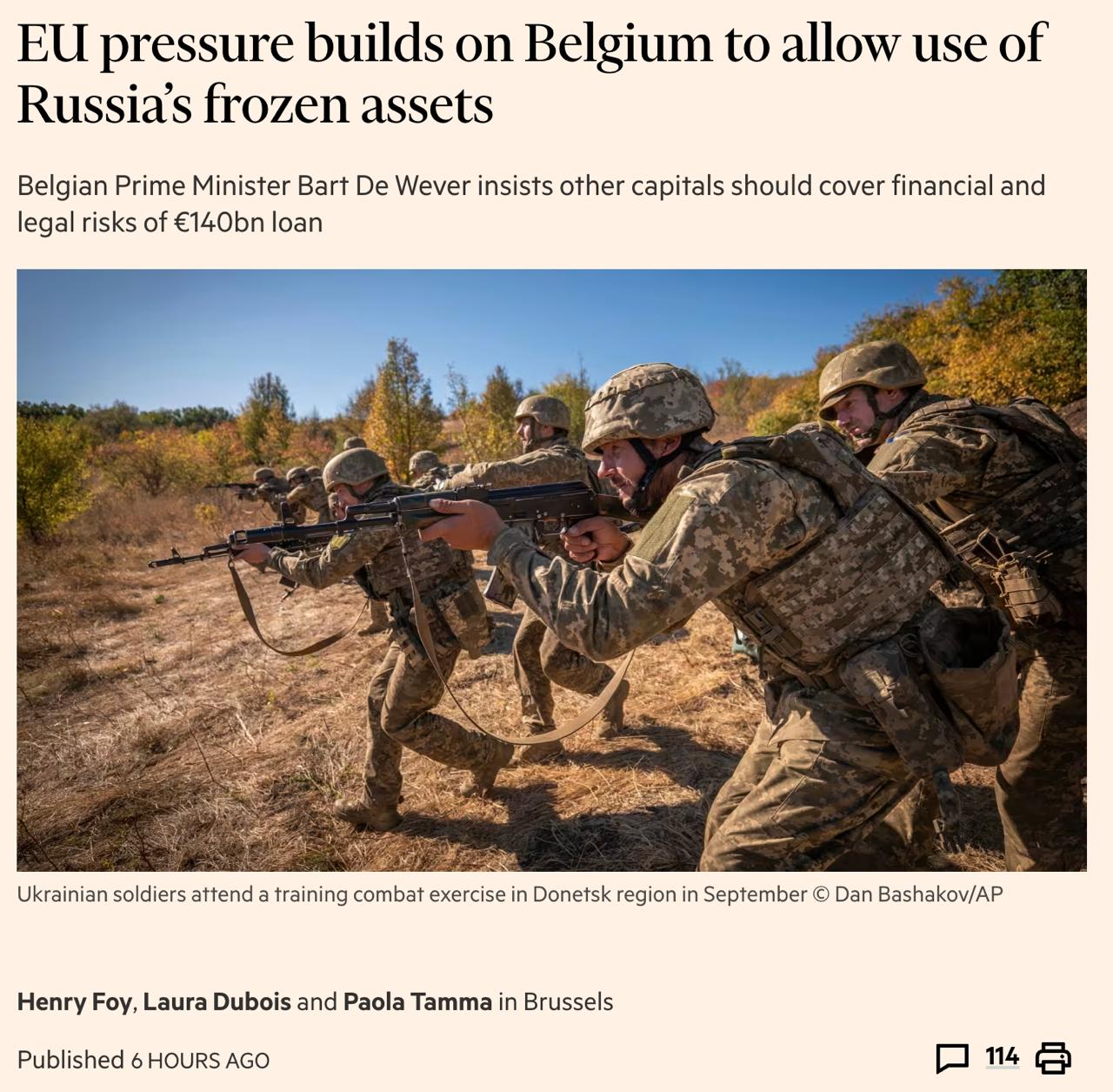 Видання пише, що бельгійський прем'єр-міністр Барт де Вевер, як і раніше, вимагає розділити можливу юридичну відповідальність між усіма країнами Євросоюзу.