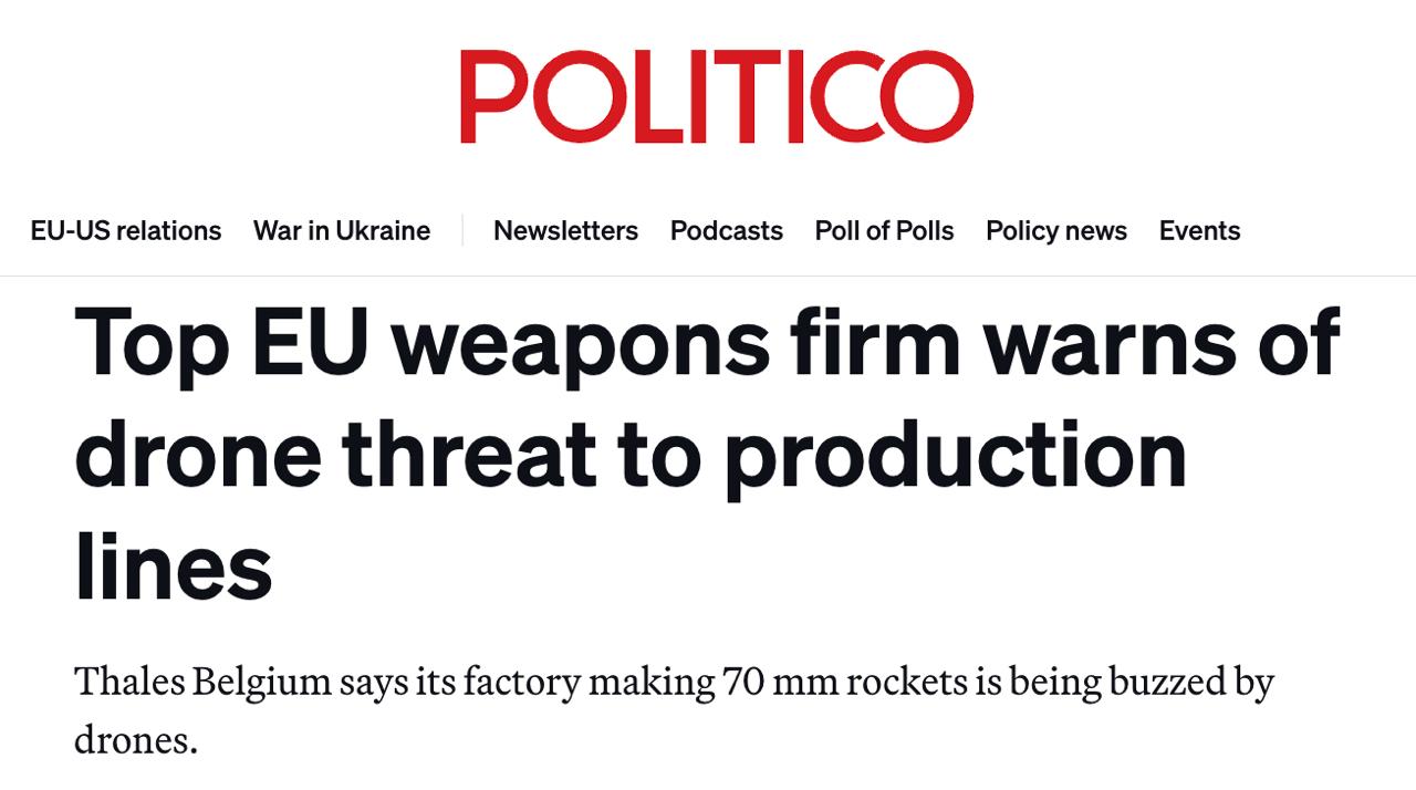 Один із найбільших європейських виробників ракет протиповітряної оборони Thales заявив, що над його "надсекретними" заводами в Бельгії дедалі частіше літають безпілотки. За словами директора Thales у Бельгії Олена Кевріна, закон забороняє компанії збивати або глушити ці дрони.