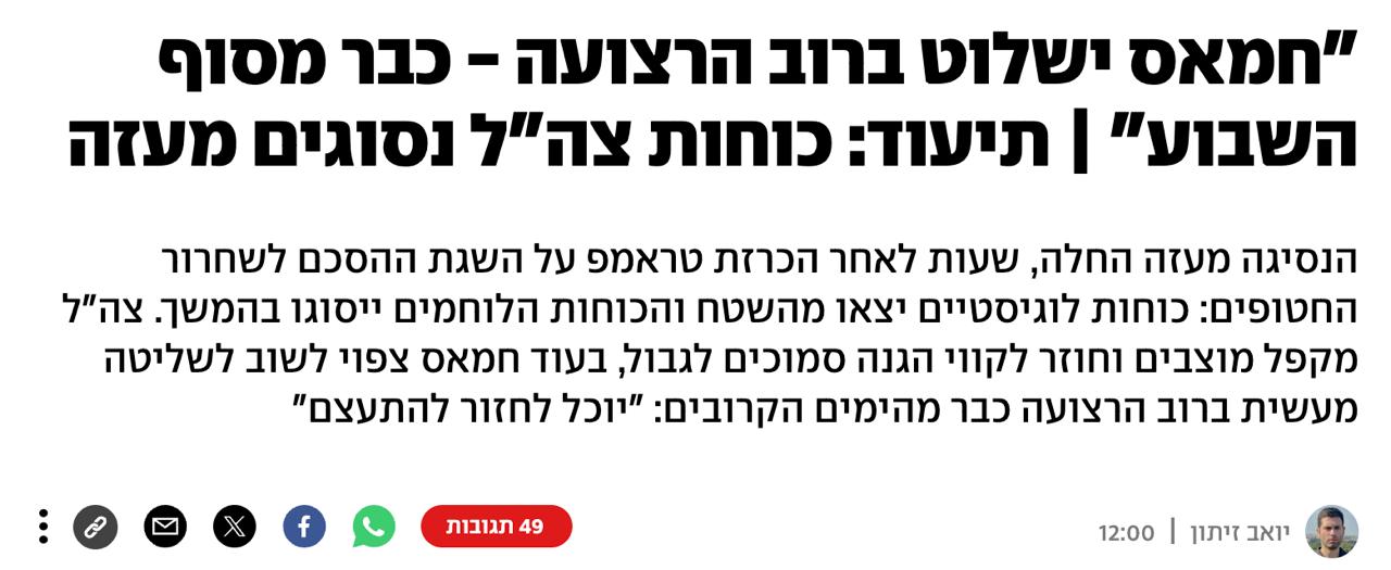 Військові джерела заявили журналістам, що "до кінця цього тижня ХАМАС відновить контроль над здебільшого сектором Гази, і, безумовно, над міськими районами". Також ХАМАС отримав гарантії від посередників, включаючи США, що Ізраїль не відновить бойових дій у секторі Гази.