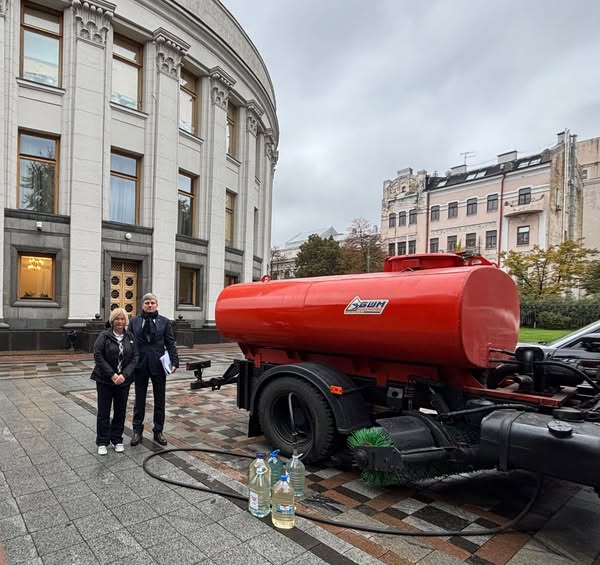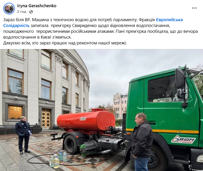 За її словами, до Верховної Ради було подано цистерну з технічної води для базових потреб парламенту. З цистерни співробітники Ради набирали воду у п'ятилітрові пляшки з-під питної води. Крім того, до урядового кварталу Києва, але вже до будівлі Кабінету міністрів доставили біотуалети.