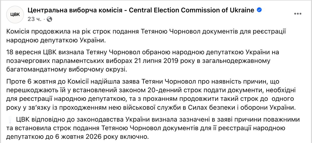 ЦВК підтвердила, що Чорновіл не відмовилася від мандата нардепа, а попросила на рік відстрочити подання документів для реєстрації парламентарієм.