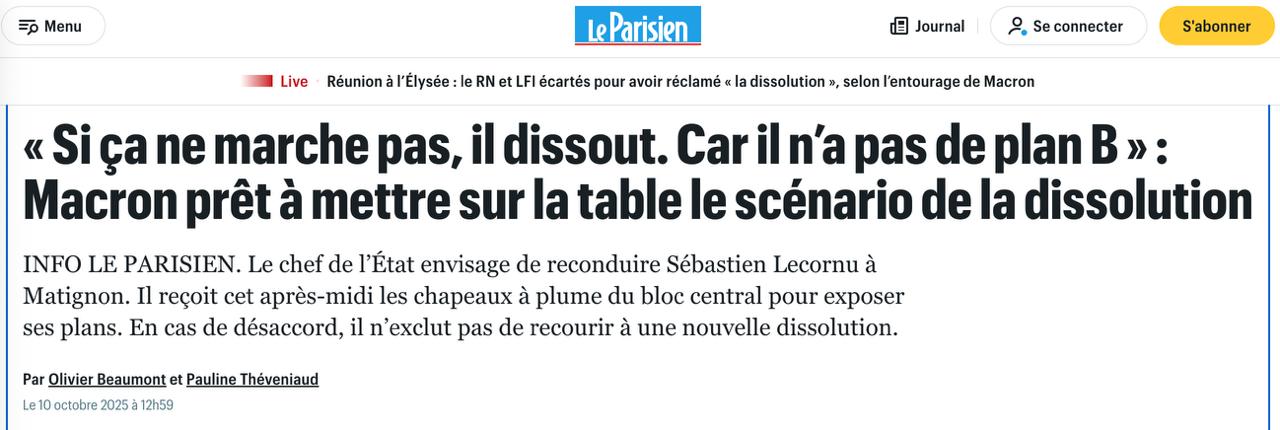 "У такому разі Еммануель Макрон готовий викласти карти на стіл: за нашою інформацією, він вдасться до сценарію нового розпуску парламенту. "Якщо це не спрацює, він розпустить парламент. Тому що він не має плану Б", — зазначає один із його близьких соратників. Це буде останній штрих тиску у вигляді президентського покеру. Все чи нічого... в останню хвилину божевільного тижня", - пише газета.
