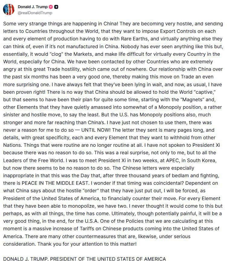 Немає жодної причини дозволяти Китаю тримати світ "у заручниках", але, схоже, саме таким був їхній план вже досить довго – починаючи з "магнітів" та інших елементів, які вони тихо зосередили, створивши певну монополію. Це дуже підступний і ворожий крок, м'яко кажучи. Але США теж мають монопольні позиції, навіть сильніші і далекосяжні, ніж у Китаю. Я просто до цього моменту не використовував їх, не було на те причин – досі!