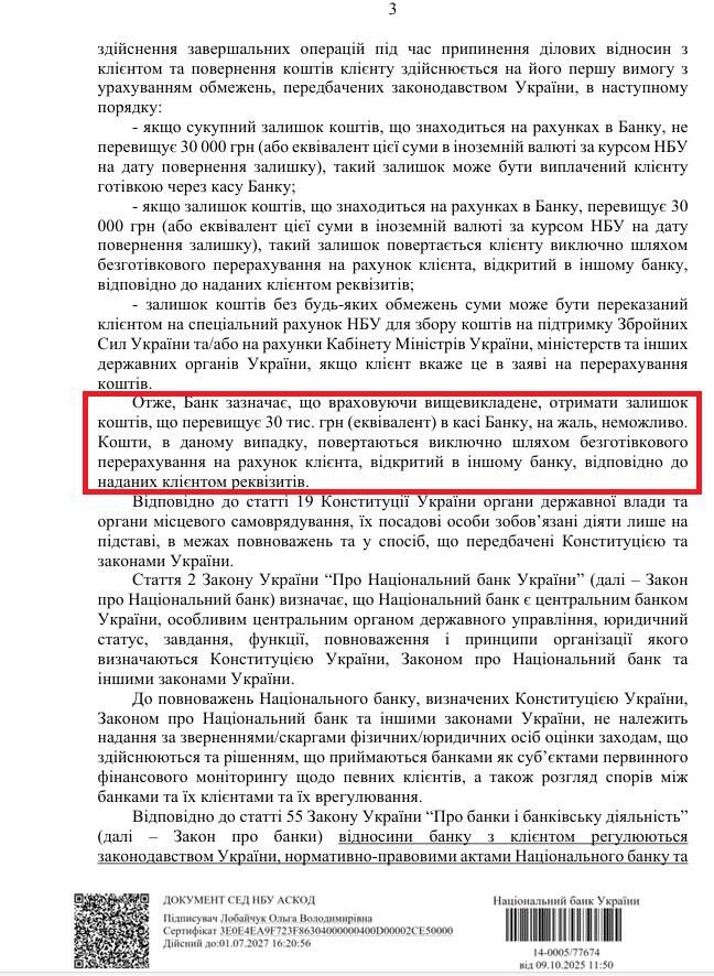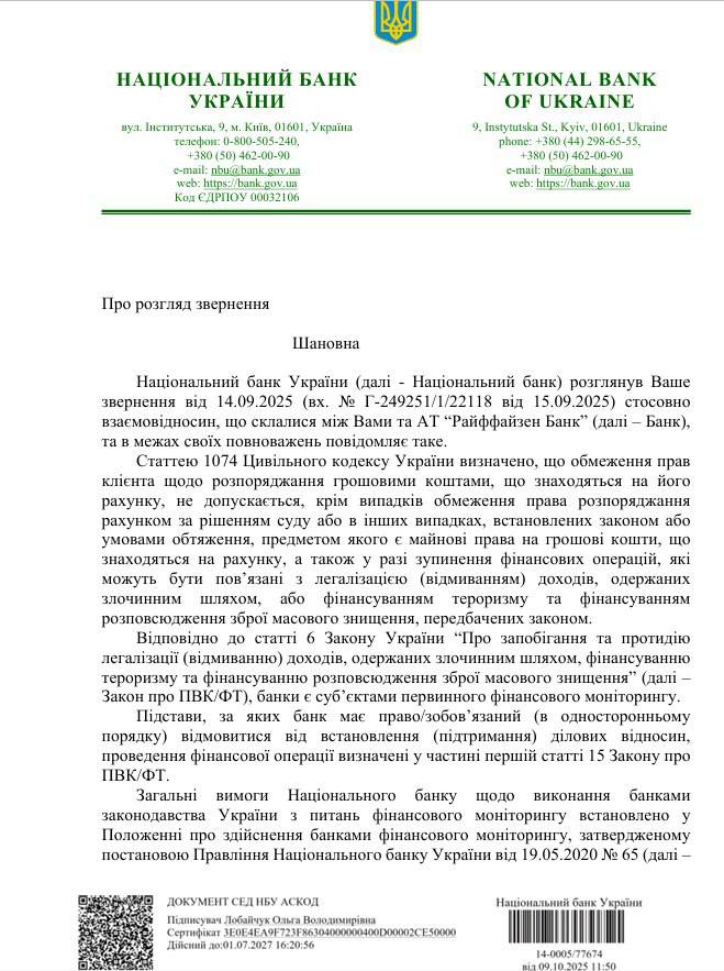 У своєму листі Національний банк визнав, що у його постанові №65 від 19 травня 2020 року щодо фінансового моніторингу не передбачені ліміти на зняття готівки в таких ситуаціях. Але в ньому зафіксовано право людини отримати кошти готівкою в касі або безготівковим переказом, без обмеження. При цьому в документі НБУ вказується, що в "Райффайзен Банку" таке обмеження є і становить 30 тис. грн. А головне – фінустанова має право її встановлювати, оскільки внесла такий пункт до договору з фізособою.