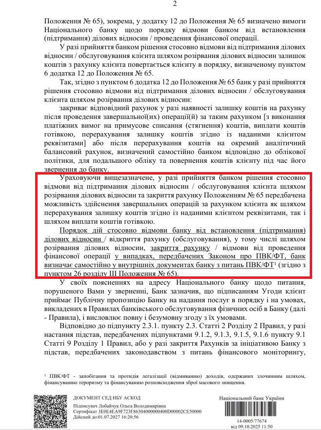 Цю позицію НБУ розписав у своєму листі №14-0005/77/674 від 9 жовтня 2025 року, який опинився у розпорядженні "Страни".