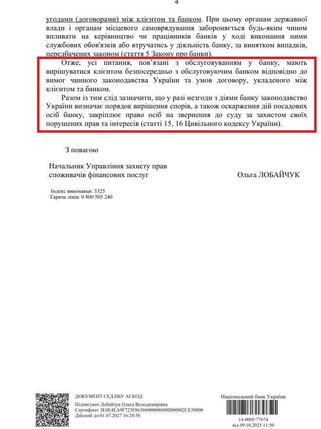 "Усі питання, пов'язані з обслуговуванням у банку, повинні вирішуватися клієнтом безпосередньо з обслуговуючим банками, відповідно до вимог чинного законодавства України та умов договору, укладеного між клієнтом та банком. У разі незгоди з діями банку законодавство України визначає порядок вирішення спорів, а також оскарження дій посадових осіб банку, закріплює право осіб на звернення до суду за захистом своїх порушених прав та інтересів", - йдеться у листі Нацбанку.