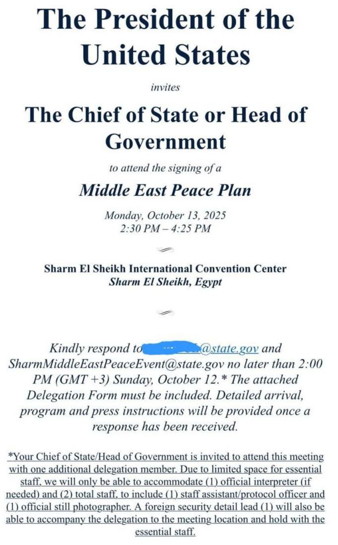 13 жовтня у Шарм-еш-Шейху відбудеться саміт світу. Він присвячений припиненню вогню в секторі Газа.