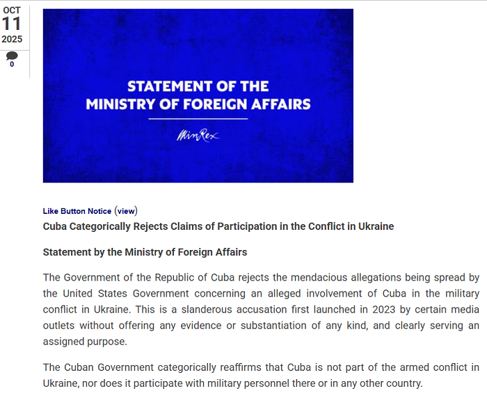 Про це йдеться у заяві МЗС Куби, оприлюдненій у суботу, 11 жовтня.