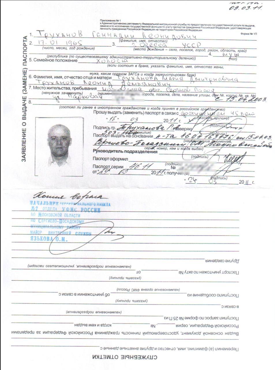 Як пише The Insider, згідно з російськими базами даних, у Труханова дійсно було два російські паспорти: перший, номер якого починається з 4604, значиться як виданий 15 квітня 2003 року і потім втрачений. Другий номер якого починається з цифр 4611 був виданий 24 березня 2011 року ГУ МВС по Московській області "натомість втраченого". У заяві на видачу цього паспорта, що також є у розпорядженні The Insider, значиться "у зв'язку з досягненням 45-річного віку".