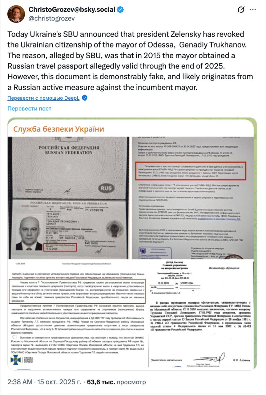 "Служба безпеки України повідомила, що президент Зеленський позбавив українського громадянства мера Одеси Геннадія Труханова. Причиною, за словами СБУ, стало те, що в 2015 році мер отримав російський закордонний паспорт, нібито дійсний до кінця 2025 року. Однак цей документ є явно підробленим і, ймовірно, є результатом активу. журналіста.