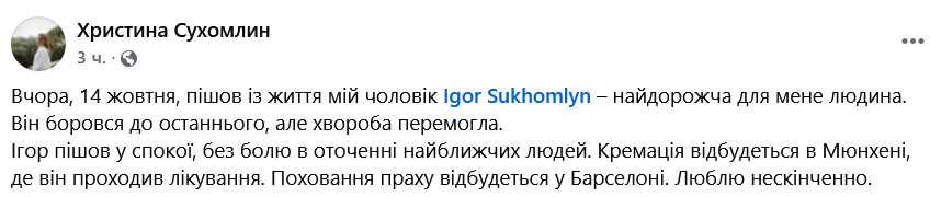 "Вчора, 14 жовтня, пішов з життя мій чоловік Ігор Сухомлін - найдорожча для мене людина. Він боровся до останнього, але хвороба перемогла. Ігор пішов у спокої, без болю в оточенні найближчих людей. Кремація відбудеться в Мюнхені, де він проходив лікування", - говориться в Барселоні.