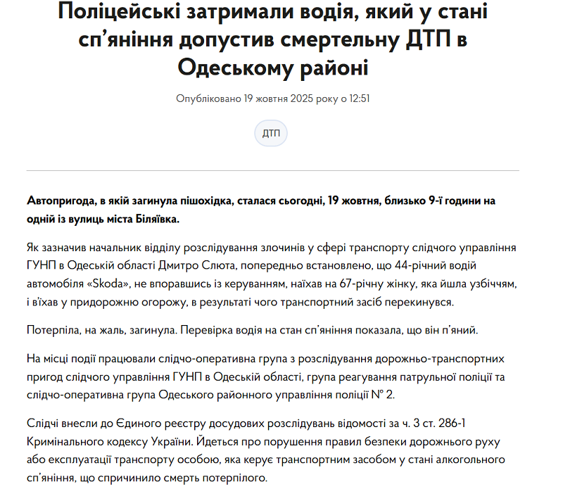 В Одесі п'яний полковник Збройних сил України на смерть збив пенсіонерку.