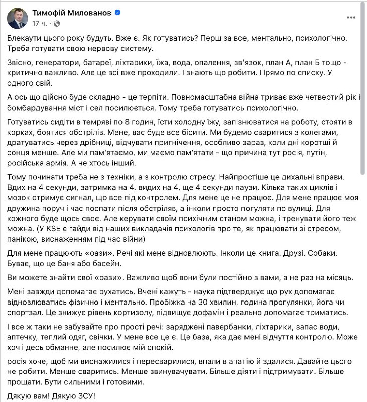 "Блекаути цього року будуть. Вже є. Як готуватися? Насамперед ментально, психологічно. Потрібно готувати свою нервову систему. Звичайно, генератори, батареї, ліхтарики, їжа, вода, опалення, зв'язок, план А, план Б і т.д. - критично важливо. дихальні вправи. Вдих на 4 секунди, затримка на 4, видих на 4, ще 4 секунди паузи. Декілька таких циклів - і мозок отримує сигнал, що все під контролем", - написав екс-міністр.