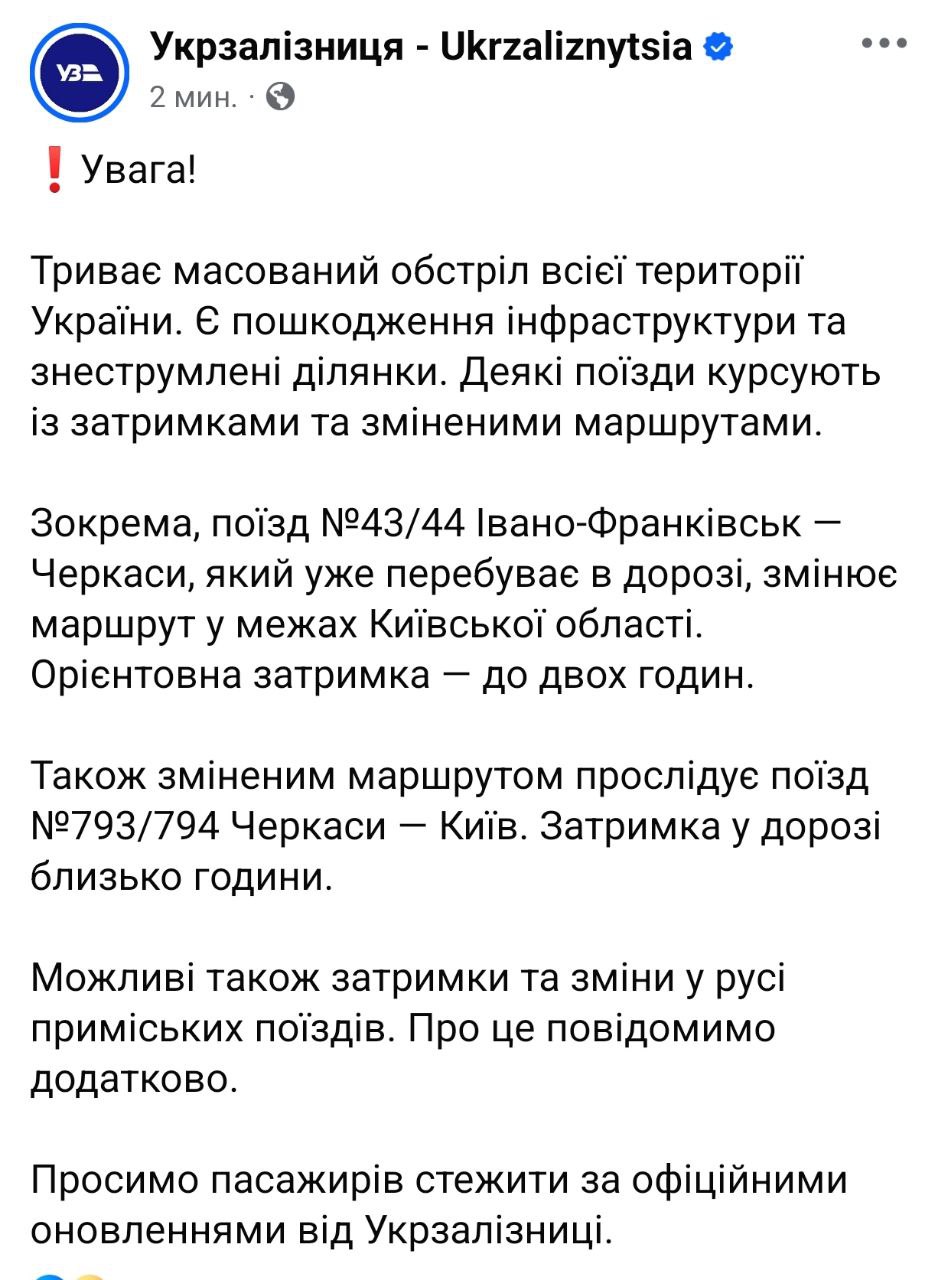08:21 Після нічного обстрілу в Україні розпочалися затримки поїздів. За даними "Укрзалізниці", знеструмлено деякі ділянки залізниці.