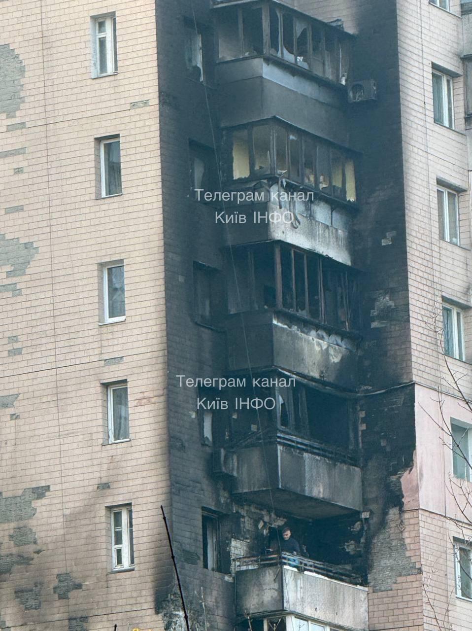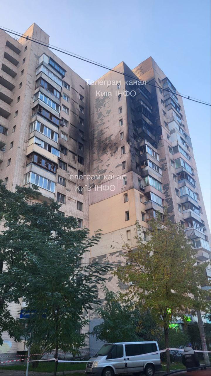 У Дніпровському районі дрон потрапив у шістнадцятиповерхівку, пожежа виникла на шостому поверсі. Там виявлено тіла двох загиблих.