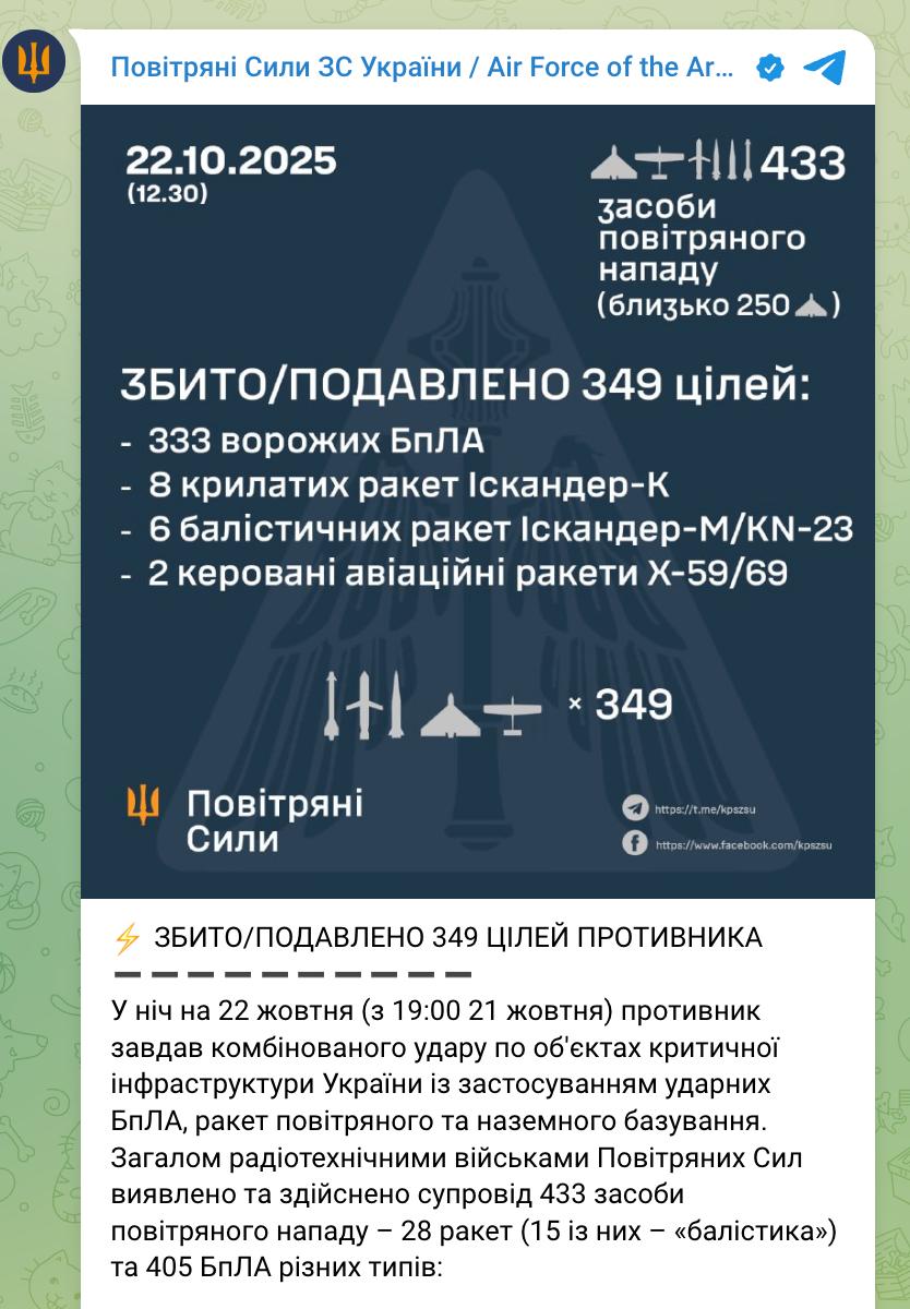 З 405 дронів вдалося збити 333. З 28 ракет (зокрема 15 балістичних) вдалося збити 16.