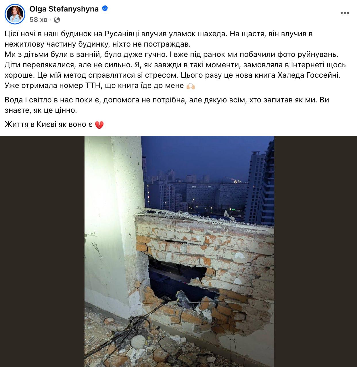 Вона повідомила, що нежитловою частиною будинку на Русанівці потрапив уламок "Герані". Стефанишина з дітьми в цей момент була у ванній кімнаті.
