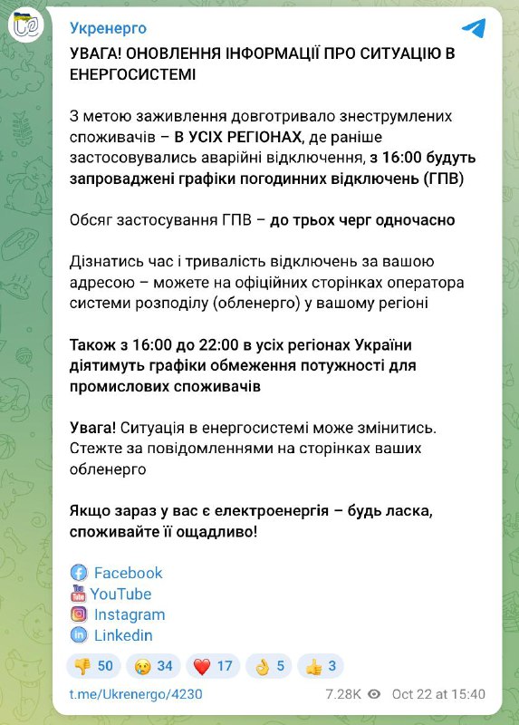 15:44 У всіх регіонах, де зранку були аварійні відключення світла, з 16:00 буде запроваджено графіки погодинних відключень, повідомляє "Укренерго".