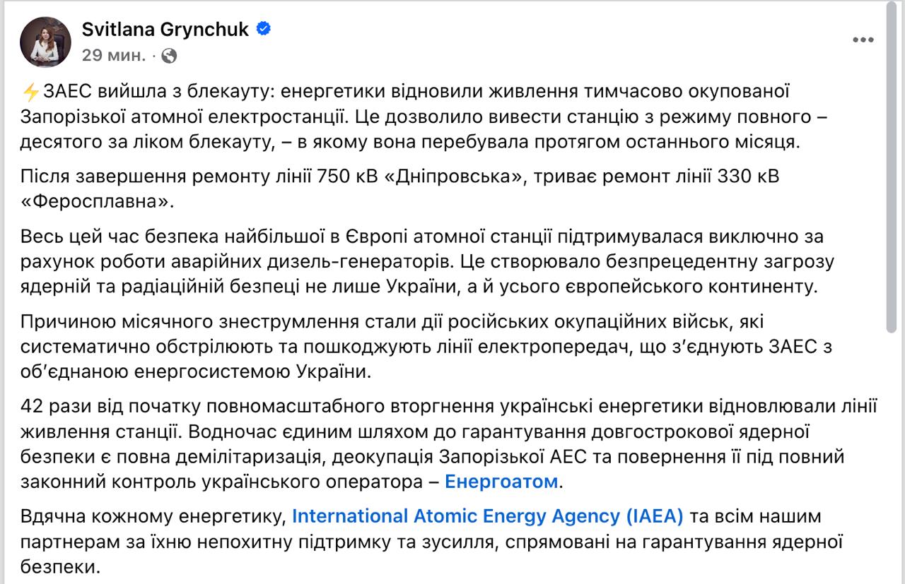 Грінчук розповіла, що енергетики відновили харчування тимчасово окупованої Запорізької АЕС, вивівши її з повного, десятого з початку повномасштабного вторгнення блекауту, що триває останній місяць.