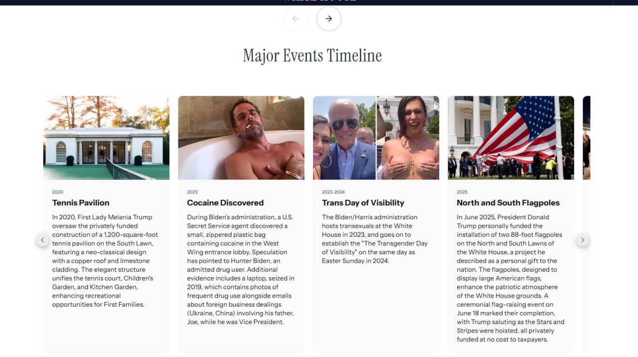 Адміністрація президента США Дональда Трампа додала на сайт Білого дому офіційну хронологію історії резиденції американських лідерів, включивши туди низку скандалів, пов'язаних із президентами від Демократичної партії. Зокрема, до хронології включено інцидент з виявленням кокаїну за правління Джо Байдена.