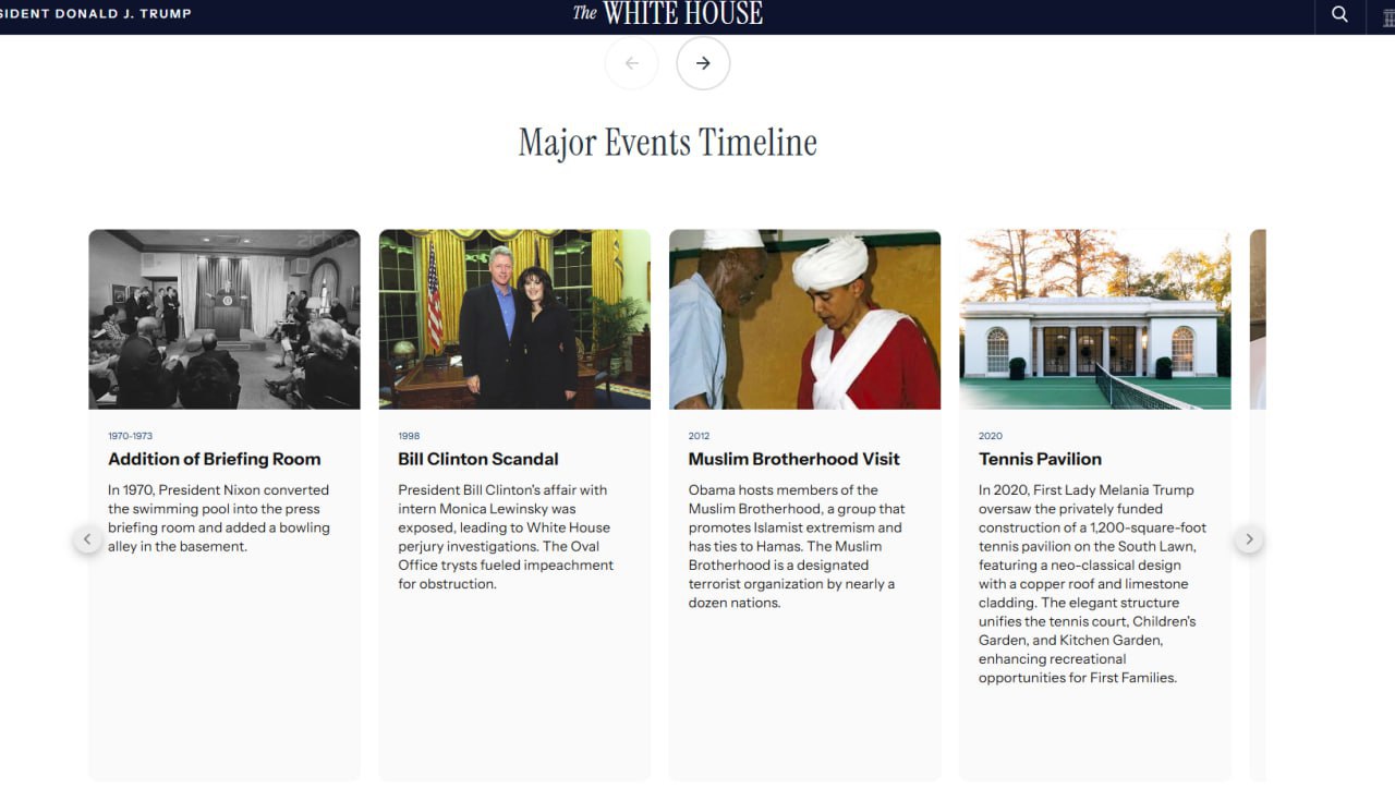 Нова хронологія з'явилася на сайті на тлі закидів з боку членів Демократичної партії на адресу Трампа через процес будівництва бального залу в Білому домі, включаючи звинувачення в корупції, а також заподіяння шкоди вигляду всього ансамблю президентської резиденції.