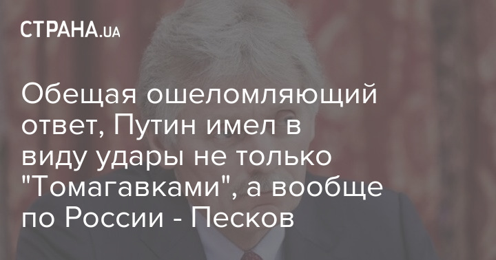Прес-секретар Кремля Дмитро Пєсков заявив, що президент Росії Володимир Путін учора пообіцяв "приголомшливу відповідь" не на постачання далекобійних ракет "Томагавк" Україні, а взагалі на спроби ударів углиб Росії.